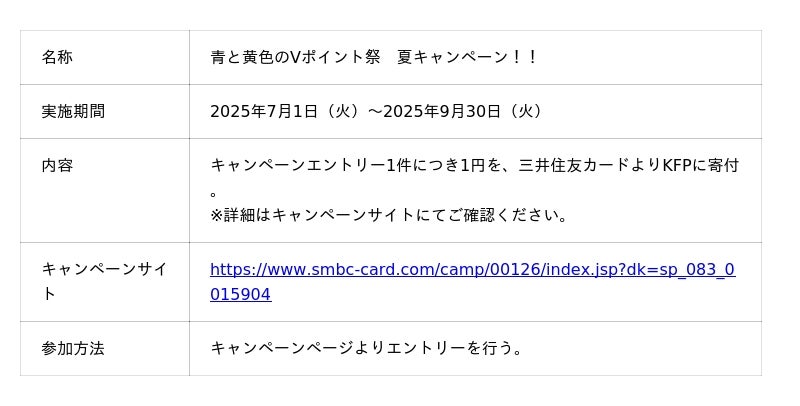 地域の飲食店を子ども食堂として活用するサービス「こどもごちめし」を運営する、NPO法人Kids Future Passport(読み:キッズ・フューチャー・パスポート/代表理事:中本真理子/所在地:福岡県福岡市博多区、以下 KFP)は、三井住友カード株式会社(本社:東京江東区、代表取締役 社長執行役員 CEO 大西 幸彦、以下三井住友カード)が2025年7月1日(火)より実施する「青と黄色のVポイント祭 夏キャンペーン!!」の支援団体先として選定されたことをお知らせいたします。