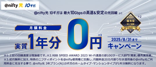 ニフティ株式会社(本社:東京都新宿区、代表取締役社長:前島 一就)は、「@nifty光 3年プラン(N)10ギガ」の新規申込者を対象に「月額料金1年分実質0円キャンペーン」を7月1日(火)から実施します。