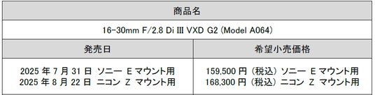 総合光学機器メーカーの株式会社タムロン(代表取締役社長:桜庭省吾、本社:さいたま市)は、フルサイズミラーレス一眼カメラ対応の大口径超広角ズームレンズ、「16-30mm F/2.8 Di III VXD G2 (Model A064)」(以下16-30mm F2.8 G2)のソニー Eマウント用を2025年7月31日、ニコン Z マウント用を8月22日に発売します。