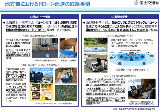北海道上士幌町、山梨県小菅村の事例(「第1回ラストマイル配送の効率化等に向けた検討会」資料より抜粋。全体資料はhttps://www.mlit.go.jp/seisakutokatsu/freight/seisakutokatsu_tk_000001_00004.html参照)