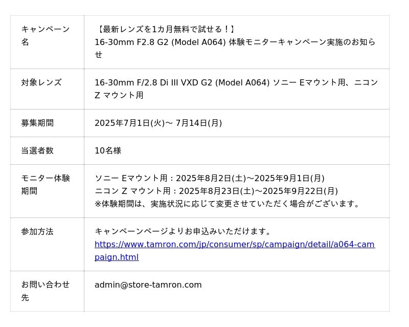 総合光学機器メーカーの株式会社タムロン(本社:さいたま市)は、フルサイズミラーレス一眼カメラ対応の大口径超広角ズームレンズ、「16-30mm F/2.8 Di III VXD G2 (Model A064)」の発売を記念して、体験モニターキャンペーンを実施いたします。