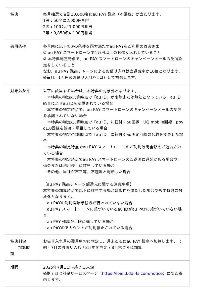 auフィナンシャルサービス、KDDI、auペイメントは2025年7月1日から、au PAYをご利用のお客さまがau PAY スマートローンを1万円以上お借り入れいただくと、毎月合計10,000名に抽選で最大2,000円相当のau PAY 残高が当たる特典(以下 本特典)を提供開始します。au PAY 残高チャージによるお借り入れで当選確率が10倍となります。なお、本特典の当選者数は、au PAY スマートローンの特典で過去最大数となっています。