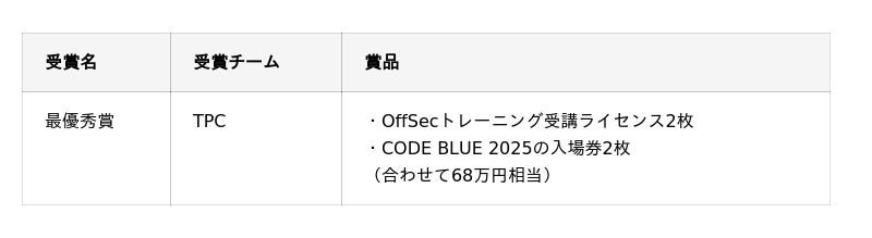 また、本大会では、日本の若手セキュリティ人財を奨励する目的で、国内の学生のみで構成されたチームを表彰しています。総合1位を獲得した「TPC」は、国内の学生のみで構成されたチームという条件も満たしていたため、ダブル受賞となりました。