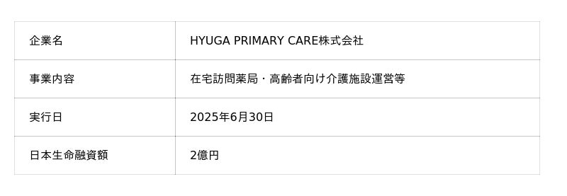 本ローンの第1号案件として実行されたのは、医療・介護インフラを担うHYUGA PRIMARY CAREへの融資です。同社は、在宅訪問薬局や高齢者向け介護施設の運営を通じて、福岡県を中心に、地域に根差した医療・福祉サービスを提供しています。社会的意義の高い事業を展開する同社は、CO2排出の削減を目指し、当社によるカーボンクレジットの提供を受け、カーボンオフセットを実施しました。