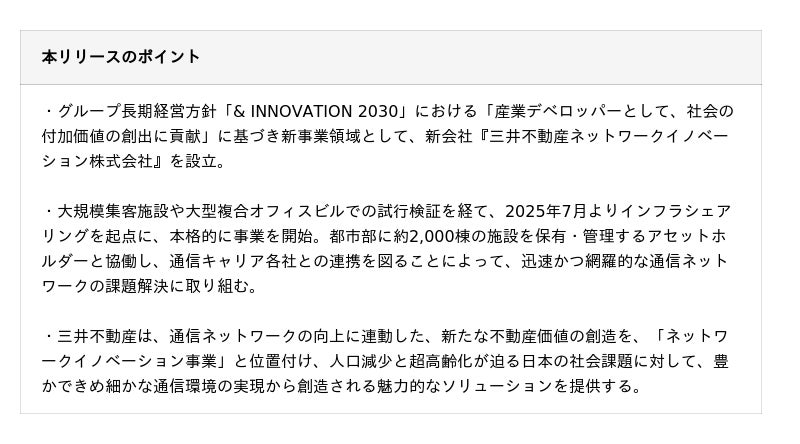 今後、都市部で急増する通信トラフィックへの対策として、都市部約2,000棟の施設を保有管理するアセットホルダーと協働し、通信キャリアとの連携によるインフラシェアリング事業(※1)を起点に、産業デベロッパーの立場から、今後、通信業界が直面する課題の解決に向けて本格的に動き出します。