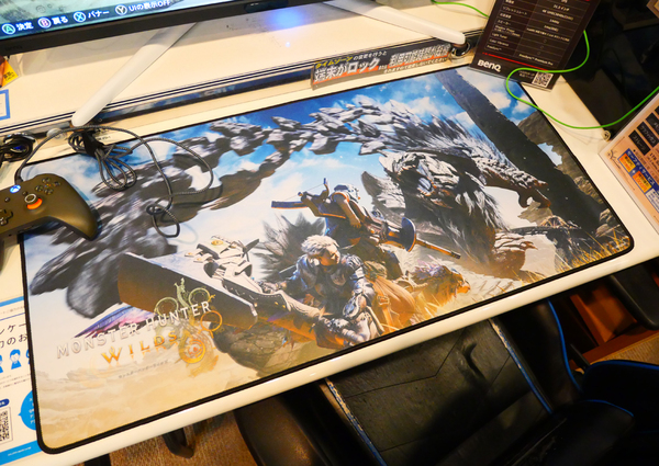 さらに、GALLERIAのモンスターハンターワイルズ動作確認済PCと、4Kディスプレーで超快適に『モンスターハンターワイルズ』がプレイできるコーナーも設置。デスクには、『モンスターハンターワイルズ』仕様のデスクマットが置いてあるほか、ディスプレー上にはチャタカブラとバーラハーラのアクスタが置いてあった。