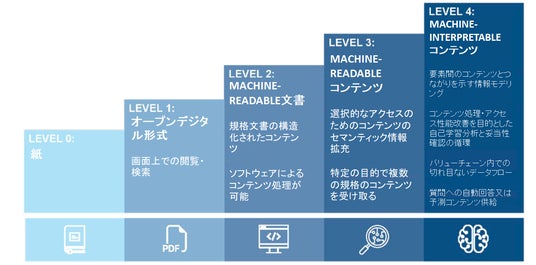 SMART規格とは、これまで人が読むことを前提として紙媒体またはPDF等の媒体で一部ずつ発行されていたISO/IEC規格を、人的労力無しにシステム上で機械が読んで適用できる「機械による適用、読取り及び移動転送が可能な規格」のことです。IECとISOの主要な共同プログラムとして、開発が進められています。(※1)「Engineering Workbench」は、この次世代のSMART規格の内容を機械(AI)が解釈し、利用できるようになった「レベル4」に準ずるサービスとして開発されています。