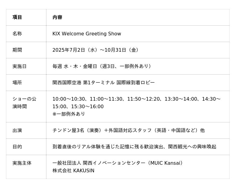 株式会社OUGI(本社:東京都港区、代表取締役・太田 高揚、以下OUGI)は、一般社団法人関西イノベーションセンター(理事長:早乙女 実、以下 MUIC Kansai)および株式会社カクシン(本社:東京都港区、代表取締役:太田 高揚)と共に2025年7月2日(水)~10月31日(金)の期間中、関西国際空港第1ターミナル国際線到着ロビーにて「KIX Welcome Greeting Show」を毎週3日(水曜日・木曜日・金曜日、一部例外あり)実施いたします。
