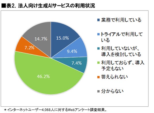 ICT総研が2025年に実施した法人向けアンケート調査の結果によれば、生成AIサービスを「業務で利用している」企業は15.0%、「トライアルで利用している」企業は9.4%で、あわせて24.4%が何らかの形で導入済であった。一方、「導入していないが、導入を検討している」と回答した企業は7.4%にとどまり、現時点での導入意向を明示している法人は限定的であった。