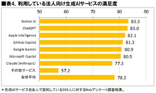サービス別の傾向としては、文章生成やタスク支援に強みを持つ汎用型AIに加え、Apple IntelligenceやGitHub Copilotなど、OSや開発環境に統合されたサービスが高評価となった。全体平均は78.2ポイントであり、多くの法人ユーザーが生成AIサービスに対して一定以上の満足感を抱いていることが示された。