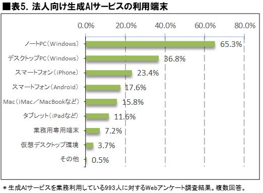 生成AIサービスの業務利用における端末環境として、最も多かったのは「ノートPC(Windows)」で65.3%にのぼった。次いで「デスクトップPC(Windows)」が36.8%と、従来型の業務用PCが依然として主要な利用環境となっている。