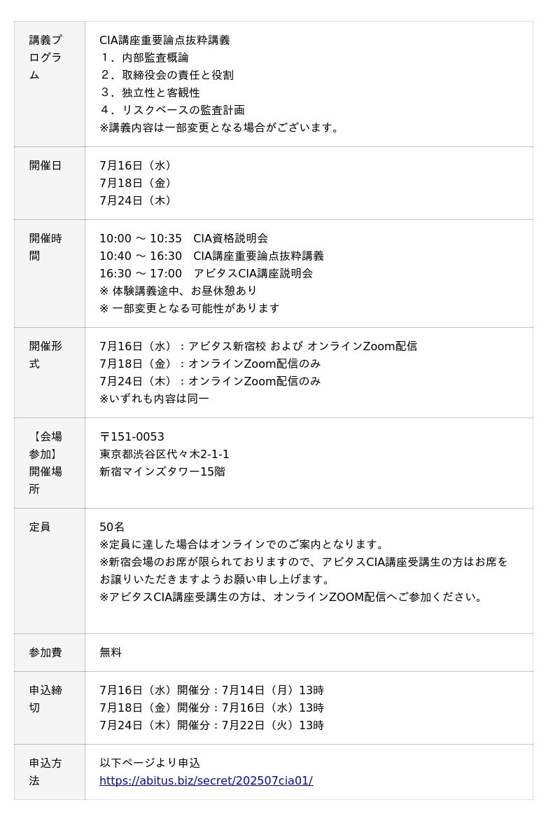 国際資格講座を展開しているパスメイクグループの株式会社アビタス(本社東京都渋谷区、代表宇坂純)は2025年7月16日(水)、18日(金)、24日(木)の3日間にわたり、2025年7月28日より開始される新CIA試験に対応した無料特別講義を開催いたします。