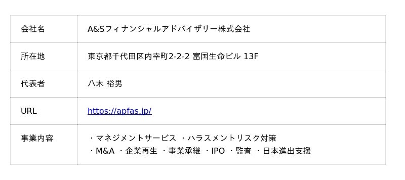 A&Sフィナンシャルアドバイザリー株式会社は、企業の組織・財務関連をはじめ、M&AやIPO支援、ハラスメント対策支援まで、幅広いコンサルティングを提供しています。企業の持続的な成長を支え、経営課題の解決に貢献いたします。
