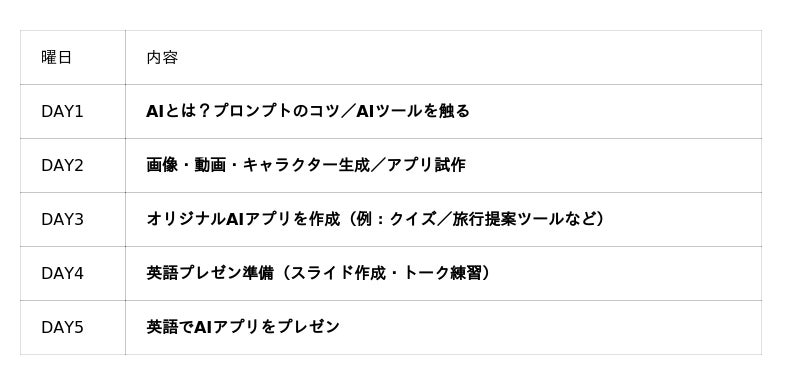 英語×AIの事前知識がない状態からでも、 講師陣が徹底的にサポートし、ノーコードツールと生成AIツールを活用しながら、最終日には“自分のアプリを英語で発表”するところまで行います。