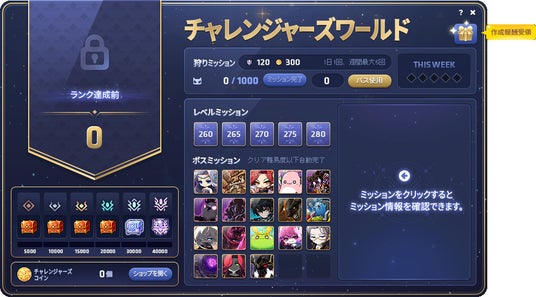 チャレンジャーズワールドで作成したキャラクターで、「狩猟ミッション」、「レベルミッション」、「ボスミッション」の3種類のミッションに挑戦しましょう。各ミッションをクリアすると、「チャレンジャーズコイン」と「チャレンジャーズポイント」がもらえます。