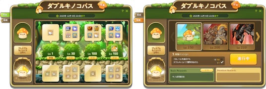 「成長ミッション」では、キャラクターが指定レベルに到達するごとに報酬アイテムをプレゼントいたします。「挑戦ミッション」では、指定ボスを撃破しながら、ミッションで手に入る装備の強化を目指します。ポイントアイテムの「プレミアムキノコパス(ダブル)」を購入すれば、両方のミッションでより豪華な報酬が獲得できます。