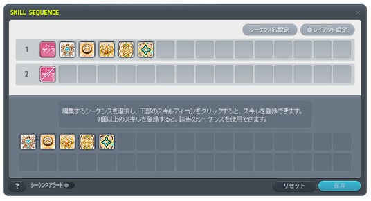 - スキルシーケンスシステム実装1回のボタン入力で複数のスキルを連続して使用できる「スキルシーケンス」システムを実装いたしました。お好きなスキルを組み合わせて登録し、状況に合わせて使用することができます。