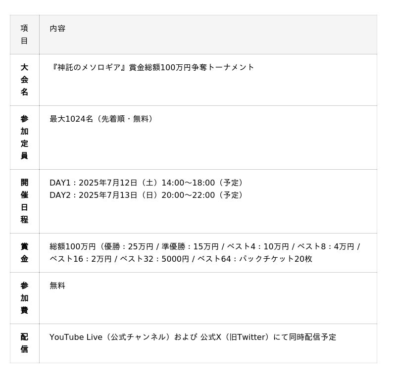 株式会社ネコノメ(本社:東京都中央区/代表取締役:工藤ショーン)は、デジタルカードゲーム『神託のメソロギア』において、賞金総額100万円規模の大型オンライントーナメントの開催を決定しました。これに合わせて参加方法ならびに大会規約の詳細が確定しましたことをお知らせいたします。本大会は現在、エントリーを受付中です。