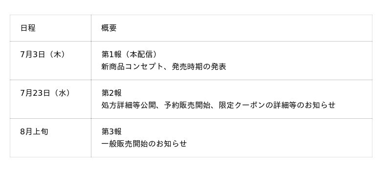 本リリースは、新商品のコンセプトと発売時期をお伝えする第1報です。製品の価格やデザイン、詳細な処方技術などについては、7月中旬以降に配信を予定しております第2報以降で改めてご案内いたします。
