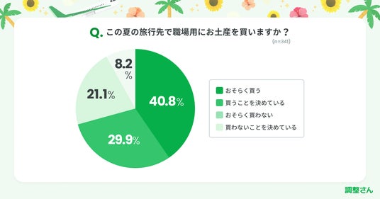この夏旅行をする予定の人に、旅行先で職場用にお土産を買う予定か聞きました。仲の良い同僚用としてではなく、部署やチームなど所属する職場全体に向けたお土産の購入意思について質問すると、最多は「おそらく買う」で40.8%でした。2位は「買うことを決めている」で29.9%となりました。これにより、全体の70.7%が「旅行先で職場用にお土産を買う予定」であることがわかり、物価高でも、職場へのお土産の費用は確保する人が多いことが示されました。