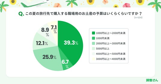上記の質問で、この夏の旅行先で職場用にお土産を「おそらく買う」「買うことを決めている」と答えた人を対象に、お土産の予算について聞きました。最も多かったのは「1000円以上~2000円未満」で39.3%でした。また「1000円未満」は6.7%で、この夏の旅行先で購入する職場用のお土産の予算は全体の46%が「2000円未満」で検討していることがわかりました。