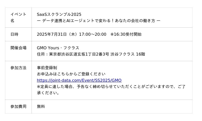 本イベントは、「データ連携」と「AIエージェント」を軸に“SaaSの導入だけでは実現できない働き方改革”に焦点をあてた、新しい視点のSaaS連携イベントです。