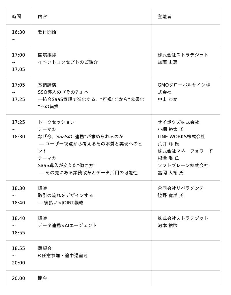 当日は、サイボウズ社、LINE WORKS社、マネーフォワード社、ソフトブレーン社など、注目のSaaSベンダーが登壇し、単なる製品紹介にとどまらず、実際の業務変革を支えるSaaS間連携の具体事例や、ユーザー起点のデジタル活用についてディスカッションを展開します。他のイベントでは得られない、「導入のその先」にある業務改善のリアルな知見と、AIエージェント・自動化がもたらす未来像をお届けします。