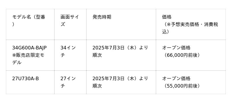 34インチ 21:9曲面型モニター「34G600A-BAJP」と、27インチIPS 4Kモニター「27U730A-B」を本日7月3日(木)より順次発売