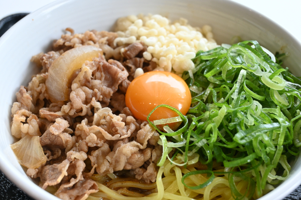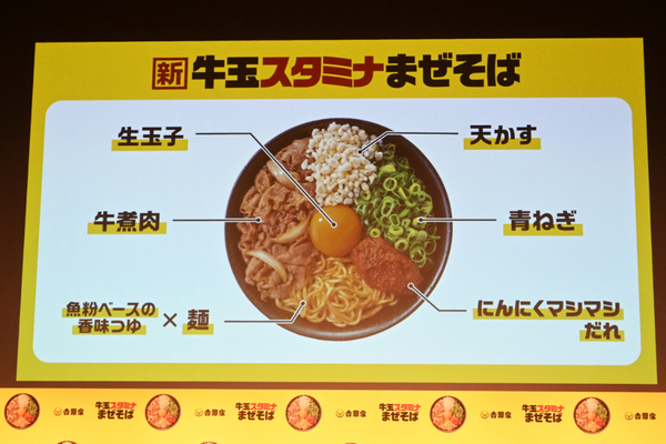 吉野家初となる麺メニュー「牛玉スタミナまぜそば」は、ストレートの中太麺にまぜそば専用の魚粉を使用した特製だれを絡め、牛丼の具材(牛肉と玉ねぎ)、青ねぎ、天かす、玉子をトッピングした一品。別添の「にんにくマシマシだれ」で、好みに応じてにんにくの風味を加えることができます。