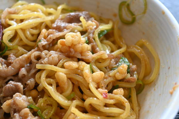 “牛丼のあたま”の、醤油ベースの親しみのある味わいそのまま。それが麺に合わさることで、どこか家庭的な雰囲気のまぜそばに仕上がっています。にんにくマシマシだれの存在感は圧倒的ですが、それでも牛丼の味をかきけすことなく相性は抜群。