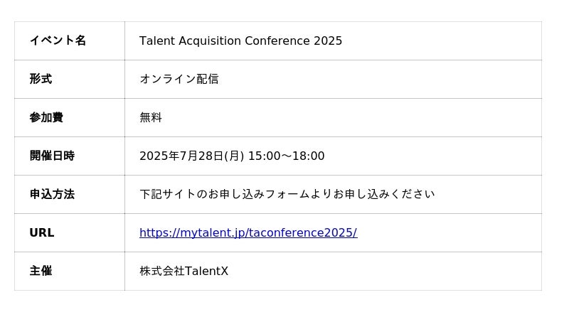 株式会社TalentX(本社:東京都新宿区、代表取締役社長:鈴木貴史、証券コード:330A、以下「TalentX」)は7月28日(月)、タレントアクイジション(Talent Acquisition、優秀な人材の持続的な獲得)をテーマに据えた日本初*の大型カンファレンス「Talent Acquisition Conference 2025(タレントアクイジションカンファレンス2025)」を開催し、オンライン配信いたします。