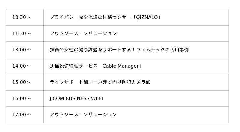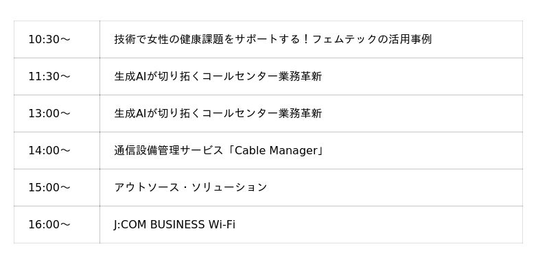 「J:COM BUSINESS」ブースの展示内容の解説や、「技術で女性の健康課題をサポートする!フェムテックの活用事例」、「生成AIが切り拓くコールセンター業務革新」など、J:COMのさまざまな取り組みに関するプレゼンテーションを実施します。■ミニセミナー内容