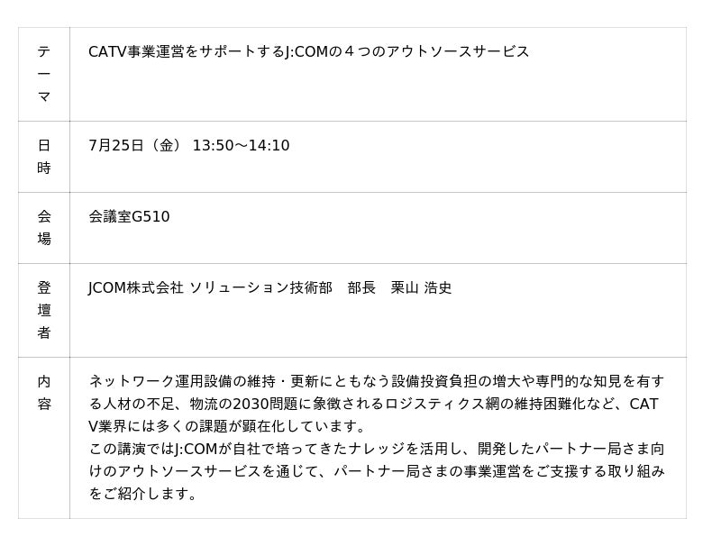 JCOM株式会社(J:COM、本社:東京都千代田区、代表取締役社長:岩木 陽一)は、7月24日(木)、25日(金)に開催される、ケーブルテレビ業界で最大のビジネスショー「ケーブル技術ショー2025」(以下「ケーブル技術ショー」主催:一般社団法人 日本CATV技術協会、一般社団法人 日本ケーブルテレビ連盟、一般社団法人 衛星放送協会、後援:総務省)に出展します。