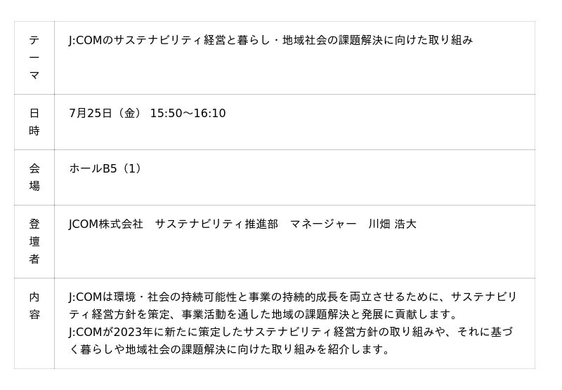 また、「J:COM BUSINESS」ブースでは開催期間中、「未来を形に」のテーマのもと、社会課題の解決やAI活用、DX推進に向けて取り組み中の事例をミニプレゼン形式で紹介します。