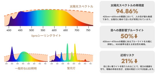 自宅での事務作業や勉強など昼夜問わず長時間、光を浴びる生活が一般化する中、今回、日本で本格的に展開する「lipro 目に優しい シーリングライト」は、日本の空間設計、光の使い方、インテリア美学を踏まえ、日本のユーザーの細かなニーズに対応した製品です。lipro製品の強みである低ブルーライト・高演色・フリッカーフリー(ちらつきなし)をそのままに、初のフラッグシップモデルを通じて、「自然光×健康照明」という新たな家庭照明体験をお届けします。