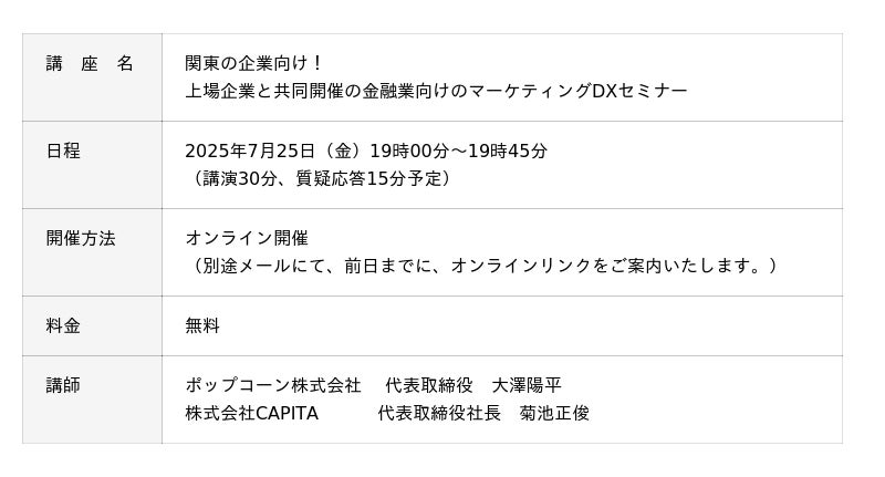金融業向けマーケティングクラウド「ポップコーン」(以下「ポップコーン」)では、月額5万円よりマーケティング・DXの顧問サービスをご提供しています。