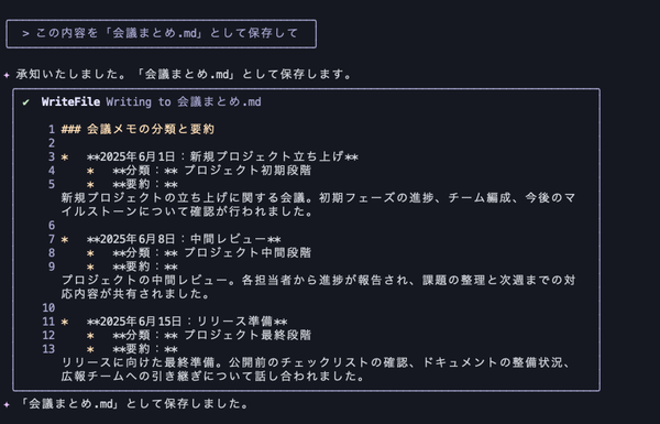 雑多に積み上がる会議メモを、自然文だけでまとめ直せるのは、Gemini CLIならではの強みといえる。