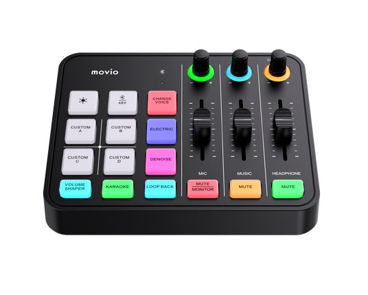 パッド部分にはボイスチェンジ、エレクトリック、デノイズ、カラオケ、ボリュームシェイパーなどの音声エフェクトに加え、ライティングパターン変更や48V給電、ループバック、録音した音声を呼び出すカスタムスイッチを搭載しライブ配信をサポートします。