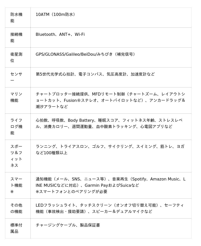 互換性のあるスマートフォンとペアリングすることで、メールやSNSのメッセージ、アラートなどを手元で受信可能。また音楽再生機能や、Garmin独自の決済システム「Garmin Pay」およびSuica※にも対応。