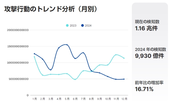 サイバー犯罪者は、新たに発見された脆弱性を悪用するために、世界規模で自動スキャンを展開している。2024年のサイバー空間における「能動的なスキャン(Active scanning)」は、前年比で16.7%増加し、過去最高レベルとなった。FortiGuard Labsの観測によると、毎月数十億件ものスキャンが確認され、毎秒3万6000件のスキャンが試行されているという。