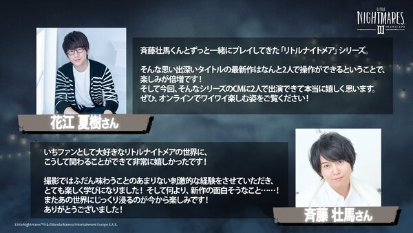 バンダイナムコエンターテインメントは7月4日、サスペンスアドベンチャー「リトルナイトメア3」のウェブCMを公開した。人気声優・花江夏樹さん&斉藤壮馬さんが出演する実写CMと、人気配信者・キヨさんの実況CMとなっている。