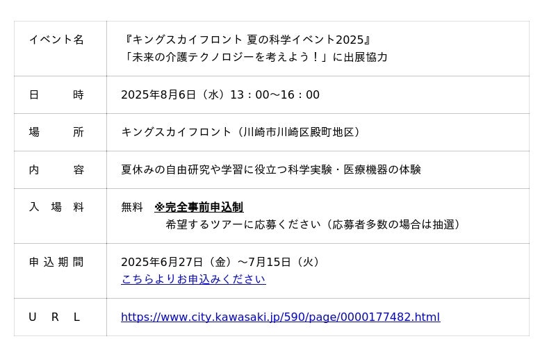 TANOTECH株式会社は、2025年8月6日(水)に神奈川県川崎市・殿町エリアのキングスカイフロントで開催される「キングスカイフロント 夏の科学イベント2025」に慶應義塾大学と連携して出展協力いたします。本イベントは、川崎市と最先端の研究機関が連携し、小学生を対象に夏休みの学習に役立つ科学実験や医療機器の体験を提供する、体験型サイエンスイベントです。
