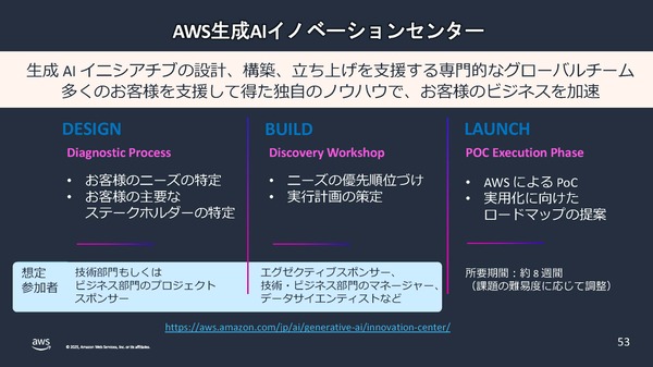 それ以外にもAWSの顧客に向けた「生成AI実用化推進プログラム(モデルカスタマイズコース/モデル活用コース/戦略プランニングコース)」や、生成AI活用を支援するチーム「AWS生成AIイノベーションセンター」「機械学習分野のAWS公式認定」制度など、さまざまな生成AI活用のためのサービスを用意しています。