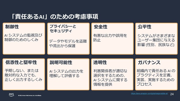 さらに生成AIの活用領域が拡大するのにともない、提供者が果たすべき責任も大きくなっていると説明します。そこで考慮すべきは「AIシステムの制御の仕組み」「プライバシーとセキュリティ」「安全性」「公平性」「信憑性と堅牢性」「説明可能性」「透明性」「ガバナンス」の8点。そして、それを実現するには「人材の育成」「ユースケースごとのリスク評価」「継続的な改善」「入念なテスト」が必要だというのです。