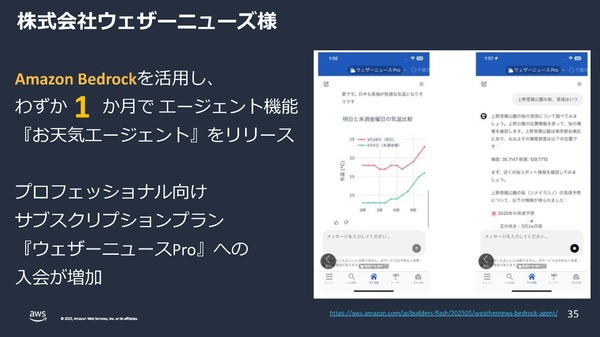 具体的なAWSのサービス導入例としてはウェザーニュース社の「お天気エージェントのわずか1ヵ月でのリリース」や、「クラウド予算計画策定が、1週間から数時間への短縮」「バナー広告のAI作成により、顧客獲得単価を73%削減」「対話型音声AIサービスの解析速度を5倍上に高め、コストを4分の1に削減した」などが報告されました。