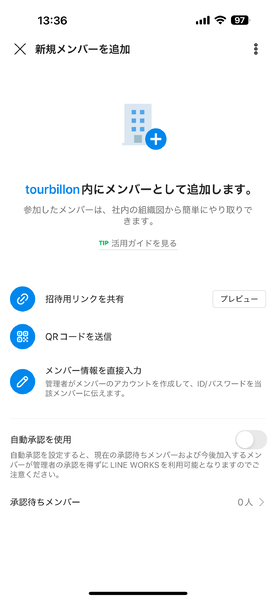 ちなみに、メンバーの追加画面で「自動承認を使用」をオンにしておくと、招待された人が登録した段階で追加されるようになる。手間は省けるが、リンクが漏洩すれば見知らぬ第三者が登録することもできてしまう。管理者が正式にメンバーを追加するかどうかを確認したいなら、「自動承認を使用」はオフにしておこう。