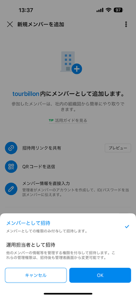 アプリ版であればホーム画面の「(企業名)の社内メンバーとして追加」をタップする。招待方法の選択肢が開くので、「招待用リンクを共有」をタップ。「メンバーとして招待」もしくは「運用担当者として招待」を選んで、「OK」をタップする。一般ユーザーの場合は「メンバーとして招待」のままにしよう。