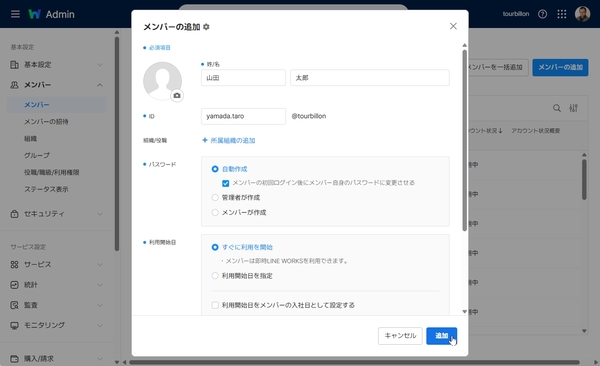 利用開始日も指定できる。「利用開始日をメンバーの入社日として設定する」というオプションが用意されているのが便利だ。もちろん、追加と同時に利用を開始することもできる。