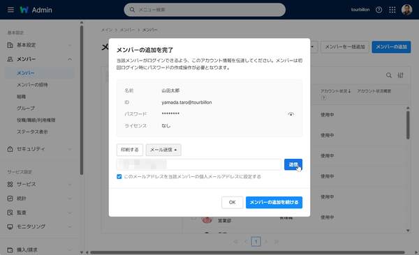 パスワードの設定方法は3種類。自動作成し、メンバーが初回ログインする際に変更してもらう方法と、管理者が作成する方法、メンバーが作成する方法だ。基本的には自動作成でいいだろう。
