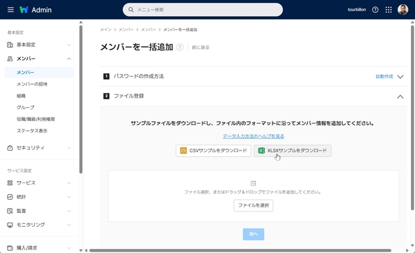 CSVやExcelファイルで新メンバーの情報をまとめて登録するが、フォーマットが決まっている。まずはサンプルをダウンロードし、そのファイルに追記するとミスしなくて済む。